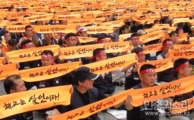 ¼èµµ¸®±ú¸¦ »ç¿ëÇÏ¿© Áø¾ÐÀÛÀüÀ» ÆîÄ¡´Â °æÂû Ư°ø´ëÀÇ ¸ð½À (»çÁø Ãâó: ¹ÎÁßÀÇ ¼Ò¸®)ÀÌ Ã¶°ñ ´õ¹Ì Àç»êÀ» Áö۱â À§ÇØ È¸»ç ÃøÀº °øÀå ¾È¿¡ ¹°°ú À½½Ä, ÀÇ·áǰÀÌ ¹ÝÀԵǴ °ÍÀ» ¹æÇØÇÏ°í ¸·¾Ò´Ù. Àü±â¸¦ ²÷°í, ¼öµµ¸¦ ²÷°í... ¿ë¿ª ±øÆÐµéÀ» µ¿¿øÇØ °øÀå¿¡¼ ÆÄ¾÷ ³ó¼º ÁßÀÎ »ç¶÷µé°ú À̵éÀ» ÁöŰ·Á´Â ¿©·¯ À뱂 ´Üü Ȱµ¿°¡µéÀ» µÎµé°Ü Æ×´Ù. ÀüÀï Áß¿¡µµ »ý¸í À¯Áö¸¦ À§ÇØ ÇÊ¿äÇÑ ÃÖ¼ÒÇÑÀÇ º¸±ÞǰµéÀº ²÷À» ¼ö ¾ø´Ù´Âµ¥, À̵éÀÌ ÇÏ´Â ÁþÀÌ ³Ê¹« ÀÜÀÎÇØ ´º½º¸¦ º¸´Ù¸»°í TV¸¦ ²¨¹ö·È´Ù. ȸ»ç¿¡¼ ÀÌ·± ÁþÀ» Çϰí ÀÖÀ» ¶§ Á¤ÀǸ¦ ÁöŲ´Ù´Â °æÂû°üµéÀº ¹» Çϰí ÀÖ¾ú´ø °É±î? ¹æÆÐ¿Í °ïºÀÀ¸·Î °øÀå¿¡ ÀÖ´Â »ç¶÷µéÀ» Âï¾î´ë°í, ¸ÁÄ¡·Î ¸Ó¸®¸¦ ¶§¸®°í, ½ºÆ¼·ÎÆûµµ ³ìÀÌ´Â ÃÖ·ç¾×À» Çï±â¸¦ ÀÌ¿ëÇØ »Ñ¸®°í, Å×·¯ »óȲ¿¡¼³ª ¾´´Ù´Â Å×ÀÌÀú °ÇÀ» ½î°í. Á¤ºÎ´Â ½Ö¿ëÂ÷ ¹®Á¦¿¡ Á÷Á¢ °³ÀÔÇÏÁö ¾Ê°Ú´Ù, ȸ»ç¿Í ³ëµ¿ÀÚµéÀÌ ¿ø¸¸È÷ ÇØ°áÇßÀ¸¸é ÁÁ°Ú´Ù°í ÀÔÀåÀ» ¹àÇô ¿ÔÁö¸¸ °øÀå¿¡¼ ÀϾ°í ÀÖ´Â ÀϵéÀ» º¸¸é Á¤ºÎ´Â µÞÁüÀ» Áö°í Àִ ôÇÏ¸é¼ »ç½Ç»ó ȸ»ç ÂÊÀ» µ½°í ÀÖ´Ù°í ¹Û¿¡ º¼ ¼ö ¾ø´Ù. ÈûÀÌ ÀÖ´Â »ç¶÷°ú ÈûÀÌ ¾ø´Â »ç¶÷ÀÌ ½Î¿ï ¶§, ½Î¿òÀ» º¸°í ÀÖ´Â »ç¶÷ÀÌ °¡¸¸È÷ ÀÖÀ¸¸é Èû¾ø´Â »ç¶÷ÀÌ ´ÙÄ¡°í Á×À» ¼ö¹Û¿¡ ¾ø´Ù. ±×°Ç °¡¸¸È÷ ÀÖ´Â °ÍÀÌ ¾Æ´Ï¶ó Á×À½À» ±¸°æÇϰí ÀÖ´Â °Å´Ù. °Ô´Ù°¡ Á¤ºÎ´Â °¡¸¸È÷ ÀÖ´Â °ÍÀÌ ¾Æ´Ï¶ó ȸ»çÀÇ Àç»êÀ» º¸È£ÇÑ´Ù´Â ÀÌÀ¯·Î Èû¾ø´Â »ç¶÷µéÀ» Ãij»´Â µ¥ ¾ÕÀå¼°í ÀÖ´Ù.