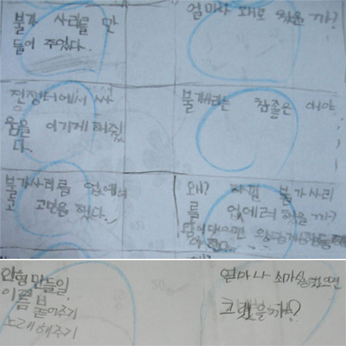 ¡°¾î¶»°Ô ¹äÇ® ÀÎÇüÀÌ ¼è¸¦ ¸Ô¾î¿ä¡±¶ó°í ¹¯´Â ²ÞƲÀ̰¡ ÀÖ¾ú´Âµ¥, ¡°¾ó¸¶³ª °£ÀýÇÏ°Ô ¹Ù¶úÀ¸¸é ±×·¨À»±î?¡± µÇ¹°À¸¸ç ³ë·¡¸¦ ÇÔ²² ºÒ·¯ º¸¾Ò´Ù. ¿Ö ÇÏÇÊÀÌ¸é ¼è¸¦ ¸ÔÀ¸¶ó°í ±×·¨´ÂÁö »ý°¢À» ¸»Çغ¸¶ó°í ÇÏ´Ï ¡°¼è·Î ÀüÀï ¹«±â¸¦ ¸¸µéÀݾƿä. ÀüÀï ¶§ °¡Á·µéÀÌ Á×¾î¼ ±×·± °Í °°¾Æ¿ä¡±¶ó°í ¸»ÇÑ´Ù. 1Çб⠶§ º¸¿©ÁØ ¡®¾ÆÀ̾ð ÀÚÀÌ¾ðÆ®¡¯ »ý°¢ÀÌ ³´Ù´Â ²ÞƲÀ̵µ ÀÖ¾ú´Ù.